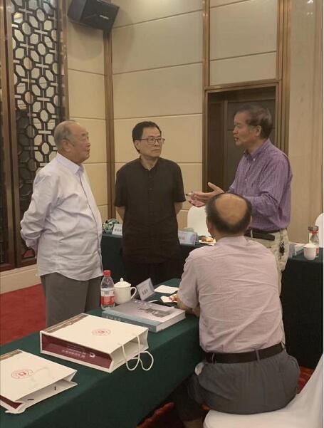 洪加祥与汝窑研究泰斗,河南省考古所专家赵青云左—,著名古陶瓷鉴藏家宁波大学古陶瓷学院院长蔡暄民左二等交流浙江龙泉青瓷的鉴定方法。