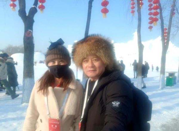 在哈尔滨冰雪大世界--冰雪节期间,接受采访的知名青年女作家孙艳萍(【笔名梵可】左) 和本报记者曹明权(右)共同应邀出席参加2020冰雪节开幕式后合影留念。