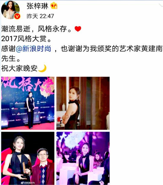 ▲张梓琳发微博感谢黄建南颁奖