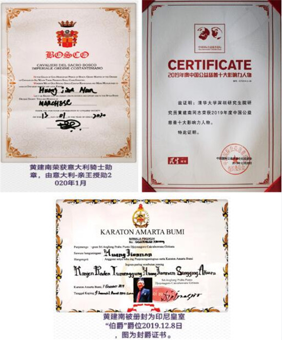 尤值得一提的是,黄建南还因对世界公益事业的卓著贡献,获得了全球公益联盟金质勋章。另外,他还担任着“世界低碳城市联盟”艺术顾问、“为奥运喝彩”组委会海外艺术总顾问,并发起公益项目“绘梦行动”。