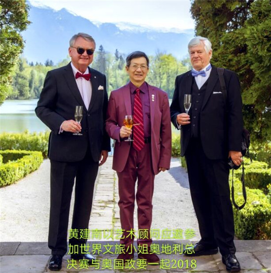 在这魅力四射的晚会上,一位年届花甲、穿着酒红色西装的男士,娴熟地为“年度时尚魅力艺人”周洁琼颁奖(如首图)。这位不止一次出现在“风格大赏”、风度翩翩的男士,不是别人,正是全球书画艺术界近几年来的大热人物,被世界权威艺术评论家称为“视觉语言艺术与表现艺术大师”的黄建南!