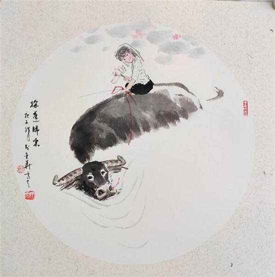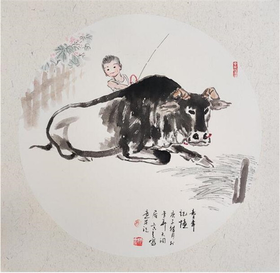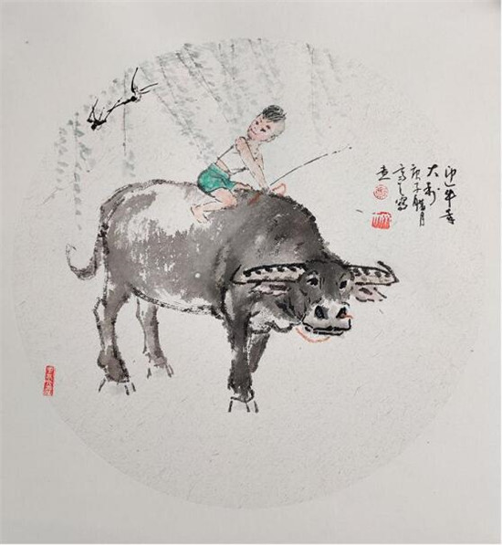 “荷蓑出林春雨细,芦管卧吹莎草绿。乱插蓬蒿箭满腰,不怕猛虎欺黄犊”。他的《迎牛年大利》,一剃“畚箕头”的小牧童手持竹鞭、牵牛绳,俯身骑在牛背上,背景是一片正在吐绿的柳树枝、两只翻飞的紫燕。牧童跨下之老水牛,正平视前方,一副悠然自得、稳步前行的样子。老牛之稳重、牧童之天真,相映成趣。