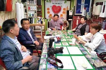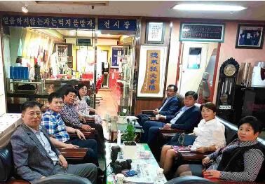 采访人员与刘命守会长等人在会社办公室内合影留念。