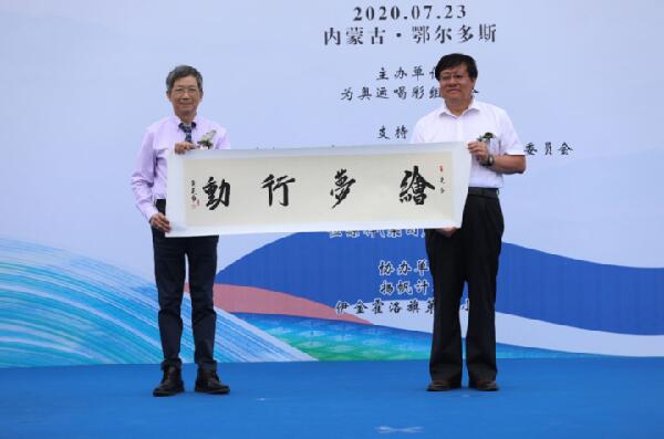 黄建南在鄂尔多斯站向学校赠送书法作品《绘梦行动》