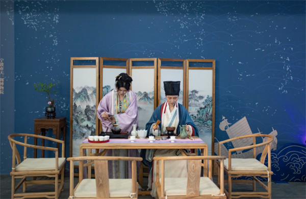 开展仪式上,舟山市委宣传部部长骆梅英、舟山市文广旅体局局长曹泓在现场致辞,大韩民国仁川广域市江华郡郡守刘天浩以视频方式致辞。在舟山市领导与韩国代表共同按下启动屏后,水墨线从屏幕穿梭,一艘帆船悠然行驶在山海间,“往来津渡—中韩交流史上的舟山”特展正式开启。随后,舟山市领导与韩国代表在讲解员带领下参观展览,并共同欣赏中韩茶道表演。