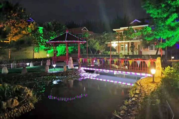园区,设施华丽不失自然,珍馐佳味汇聚八方菜系,色味俱全倾醉四方宾朋。齐身清风枕生香,花雨相牵月伴眠,红尘难觅温馨处,返璞归真花水湾。