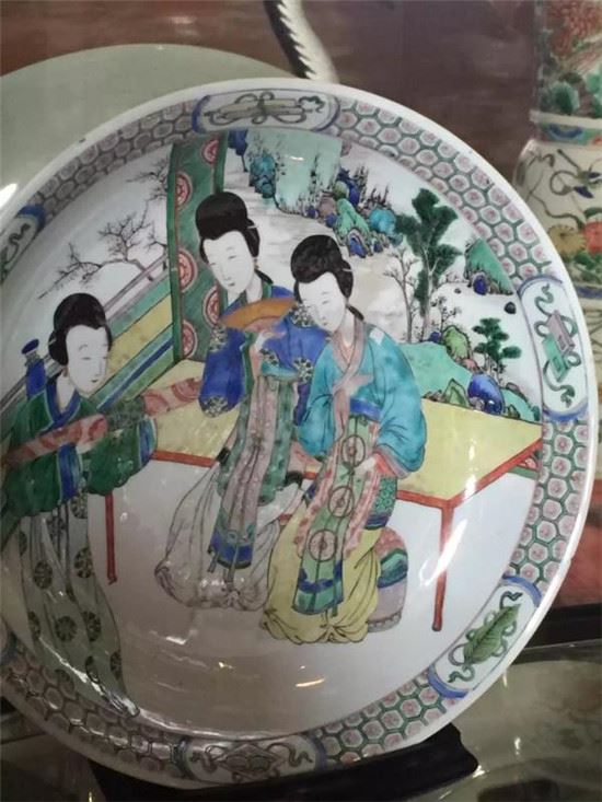 洪加祥在英国伦敦一家古玩店,鉴定康熙五彩人物盘。