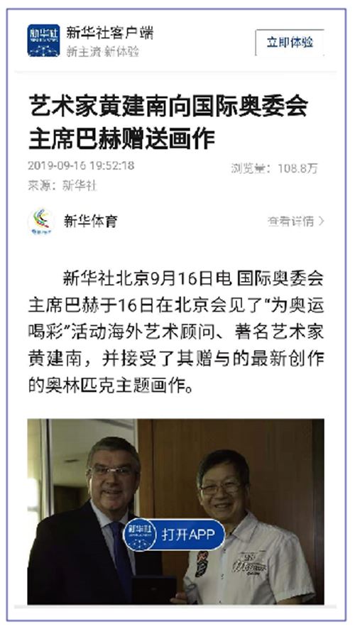新华社当天以《艺术家黄建南向国际奥委会主席巴赫赠送画作》为题(如下截图)进行了报道。据说,巴赫非常珍视这幅《奥运之花》,随后把它带回了瑞士。