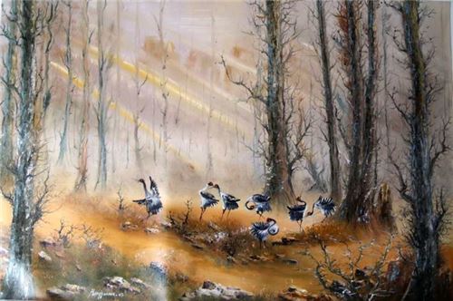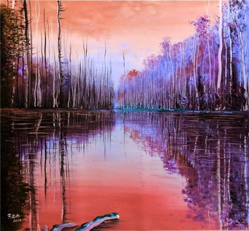 黄建南为2022年冬奥会创作的《奥运之花》,从画面中可以看到黄建南代表性的蓝色星空以及黑白相间的山峦,湖面几只白色的鸟儿展翅飞翔,夜晚的天空倒影的水面上,呈现神秘的绿光。最妙的是那几朵晶莹剔透的冰花,花心一点红,明艳无比,动人无比。整幅作品采用了黑、白、蓝、绿、红等颜色为主色调,接近奥运五环的颜色。