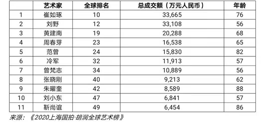 前言:12月18日,胡润研究院联合上海国际商品拍卖有限公司发布《2020上海国拍·胡润全球艺术榜》(SICA·Hurun Global Art List2020),榜单内容为前50名全球在世艺术家按照2019年度公开拍卖市场作品总成交额的排名。这是胡润研究院继连续十三年发布“胡润中国艺术榜”之后,首次发布“全球艺术榜”。在该榜单中,黄建南列居第19位,在中国艺术家中,仅次于崔如琢、刘野(如下图)。