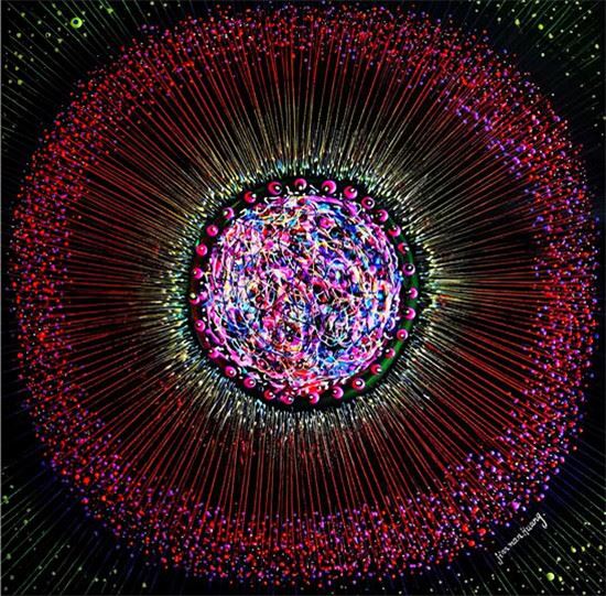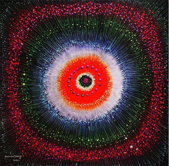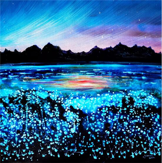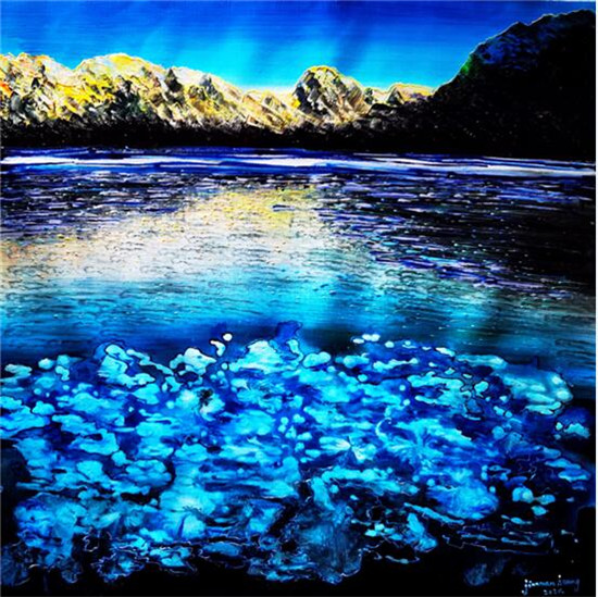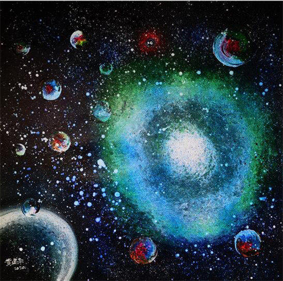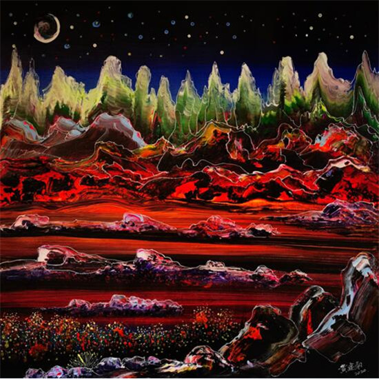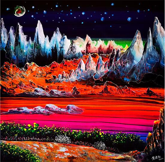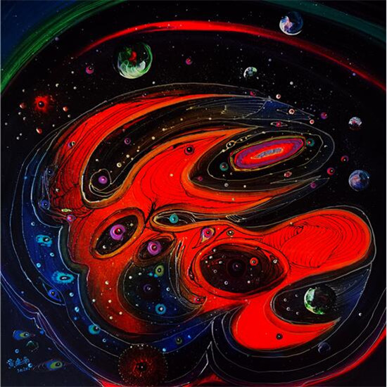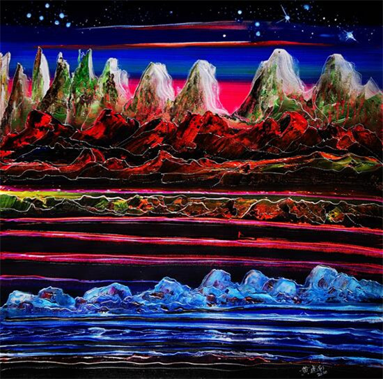 黄建南的油画和国画的画面色彩都鲜艳绚丽,想象力超凡,并呈现出了立体多元的空间画面感,不仅给予观赏者一种强大的震撼力,而且画面充满了神秘力量,给人的感受非常独特。