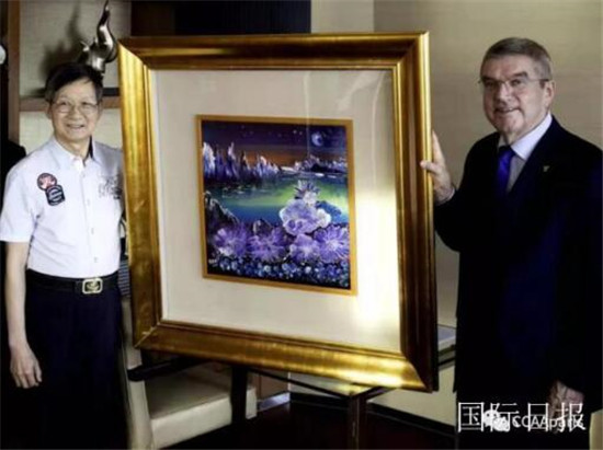▲黄建南向国际奥委会主席巴赫赠送《奥运之花》