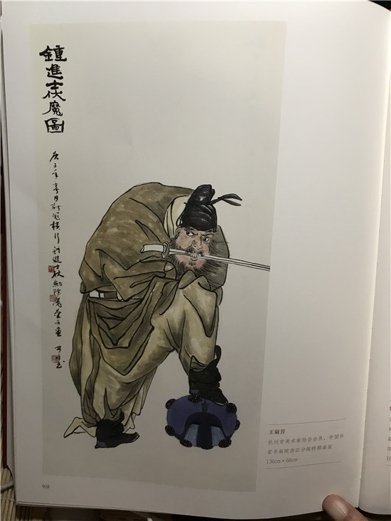 图为王菊芳作品《钟进士伏魔图》讲述庚子之春,新冠横行,钟进士仗剑除魔,此作品入选浙江美术馆2号厅展出并收藏入册。两幅作品均为抗疫篇。