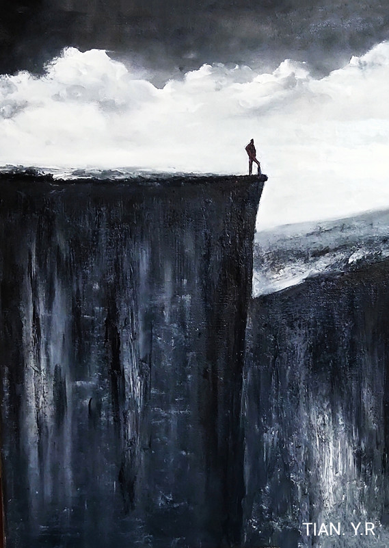 孤独,那种略带忧郁却毫不犹豫的孤独,那种虽千万人吾往矣、甚至一去不复返的孤独,那种天无绝人之路而“山登绝顶我为峰”的孤独,正是这幅油画的聚焦点和闪光点。世界数百年油画史上,前所未见这样将人生孤独刻画得如此惊魂骇目,如此壮烈决绝,同时又如此感人肺腑的场景。画面上方,那是天国的云彩吗,一片悦目迷人的亮丽斑斓,宛如美好的梦境缥缈而浪漫,伸展着白鸥又似仙鹤一般的翅膀飞翔,带给我们无限的遐想。人们不是在说吗,“海是龙世界,云是鹤家乡”。那么飞吧,无论你是传说中神奇的鲲鹏,还是“高翱翔之翼翼”的凤凰,猛禽中的王者苍鹰、了不起的巨隼,抑或只是在寻常人家筑巢的燕雀,只要飞翔就会遇到属于自己的障碍,以及足以令自己难看的险境……但是,天地之间,没有翅膀的人却最善于飞越,他们飞越自身的局限和外界的限制时是那样大胆果决,义无反顾,勇往直前……你看到悬崖上双手叉腰的那个人,体量是那样的小,对吗;而在我的视界里,这位孤寂、倔强的勇士,身形却是如此高大。他不仅仅是身材高过万仞山崖,他的骨头也一定比粗砺的石头更加坚硬,更何况他有一颗比那些玄武岩、花岗岩和石灰岩要年轻得多、更火热得多的心灵!