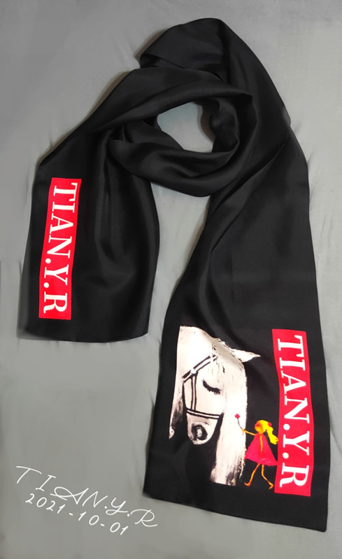 这样一匹已经获得专利的画家田迎人的白马,印制在一条精致的黑色丝巾上,它带给我们的视觉享受上的冲击力和围绕在颈项上的温存抚慰感,一并会使人感到一种身心的满足和愉悦,即使你的灵魂为之幸福地战栗也不足为奇。我们到哪里去寻找如此浪漫多情的一帧油画,又到何处去寻觅这样质地细密的丝织品。打开精美的包装盒,一根洁白的羽毛在向你招手,那铺展开来的纯黑色的丝巾,如同神秘、幽邃的夜色弥漫,静谧而又深沉,空阔而又辽远,抬眼望去,在那天边一角,一匹白马蓦然出现……