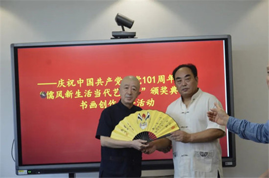2022年6月25日上午9时,庆祝建党101周年“儒风新生活当代艺术家”颁奖典礼及书画创作笔会活动在山东华邦建设集团济南办事处隆重举行。山东省高级法院原院长、省人大原副主任尹忠显,山东省委原副秘书长孙振华,山东省老年学与老年医学学会会长、山东大学原党委副书记方宏建,山东省检察院艺术家协会主席赵继明,山东省农业厅原副厅长尹宗元,潍坊日报社原社长齐延升,中国品牌战略发展研究中心主任,国学推广创新联盟主席、儒风新生活推广委员会主任、孔子奖章组织委员会主席团副主席孙勇,曲阜师范大学国学院副院长、国学推广创新联盟执行主席、儒风新生活推广委员会执行主任、孔子奖章组织委员会秘书长邢学坤,华侨传媒网总裁,山东省生态文明建设中心常务主任鞠成立等领导,艺术家王金生、韩玄真、云门子、亓汉友、李宗玮、徐鹏、龚存银、张顺、王晓亭和王洪山等60余人参加了活动。孙勇主持了活动。