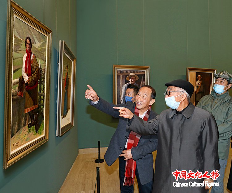 韩玉臣陪同中国美术家协会名誉主席靳尚谊(右)参观“璞心逐梦——韩玉臣油画写生作品展”时,靳尚谊对韩玉臣深入生活、扎根人民创作出的油画《甘南楞本刀吉》等作品给予了高度赞誉