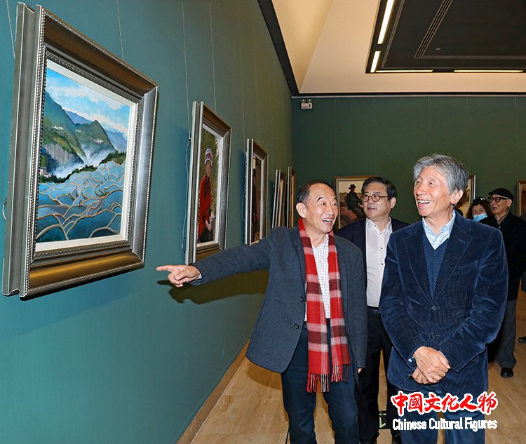 中国美术馆馆长吴为山(右)参观“璞心逐梦——韩玉臣油画写生作品展”时,对韩玉臣创作的讴歌人民、赞美生活、反映新时代大好河山的油画作品给予了高度赞赏