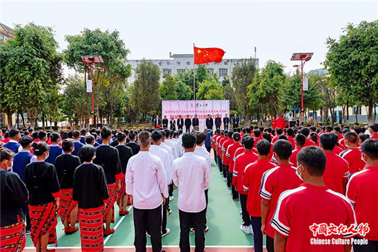 在沧源佤族自治县职业技术学校全体师生的掌声中,唐兴平与周昌新共同为昌新佤族艺术班揭牌。