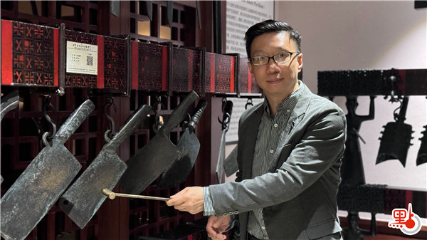 美中信使報副社長吳迪認為將編鐘與刀結合在一起很有想法和創意。(點新聞記者黃寶儀攝)