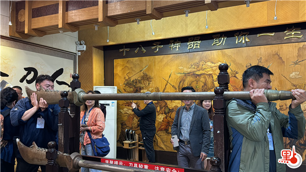 據介紹,刀剪五金是陽江的特色優勢產業,「十八子」是當地知名刀具品牌之一,其集團總經理李積回同時還是一名音響發燒友,於是創辦了這麼一家極具特色的以「音樂與刀」為主題的專題博物館。天下第一刀、十八子關公刀、刀韻編鐘、菜刀、魚刀……看着那些能清晰倒映出人影的刀具,華媒代表紛紛變身成「小孩」,紛紛拿起刀來,還嘗試揮舞幾下。