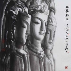 概而言之,王玉良的水墨造像系列作品,可谓是极传统而又超现代的绘画艺术。“极传统”,是指他的表现题材――千年前的佛教人物;“超现代”,则是指他的艺术表现形式――将三维的石刻造像二维化,进而拉入中国画的表现范畴,王玉良当是始作俑者。《三尊玉立》,描绘的是三尊并肩而立的菩萨雕像,尽管表现的是凝固的石刻造像,但我们随处都可以感触到画家的 “巧思妙想”。构图上,三尊菩萨由近及远,依次错开,前后二尊皆为俯首凝视之状,神情肃穆而又觉默默含情。中间者却一改常态,作侧目回首之姿,虽是一个小小的改动,却给整幅画平添了无穷人文气象。同时在这回首的刹那,人与神之间仿佛穿越了千年的历史封尘在这艺术的殿堂得以际遇。