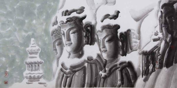 表现佛教故事,为佛教人物造像,这在魏晋南北朝时期就已经很是盛行了,且这种佛教题材的艺术表现一直延续到了今天。然而,艺术家不管采用绘画还是雕塑的手段,都始终表现的是他们意象中的佛教形象符号。而王玉良的绘画艺术,则利用中国画的笔墨材料,采用现代摄影的构图方式,直接面对历代石刻遗迹,营造出了西画般强烈的明暗艺术效果,既具有石刻艺术的坚实质感,又不失绘画艺术的唯美形式。在水墨的运用过程中又融入了素描关系的准绳,对水分的应用更是到了随心所欲,匪夷所思的入化境地,他一改以往中国画以水运墨,墨为主、水为辅的技法原则,将偶然的“水线”幻化成了自己作品必然的风貌。“水为实、墨为虚”――这是对传统艺术理念的大胆革新,也是对水墨艺术表现力的新的开拓与发掘,诚如韩朝所言:“淡墨明澈清润,浓墨华滋深玄,浓淡相宜,弥散着一种玉般的品质,这是对没骨技法的新发展”。