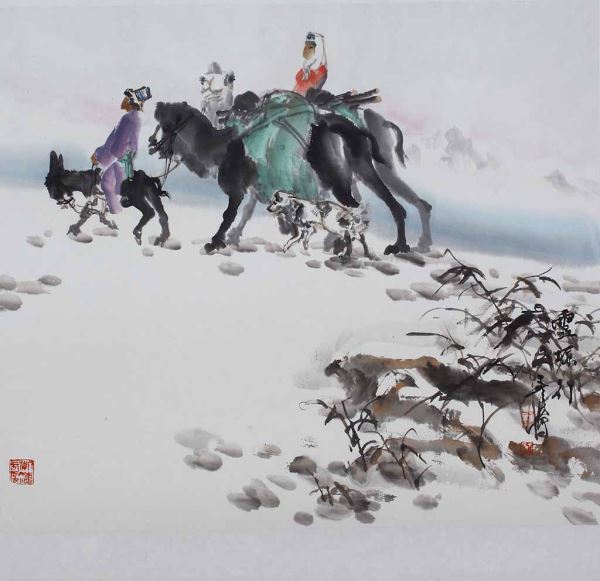 此外,王玉良表现山水、人物也是风格独具,别有新意,常有一些逆向思维的味道。表现雪景,更是得心应手,如《卢沟之雪》等作品,虽是寥寥数笔,却能将寒雪的铺天盖地之势尽现画中,对水墨黑白关系的独到处理也总能使他的画面产生一种令人耳目一新的冲击力。