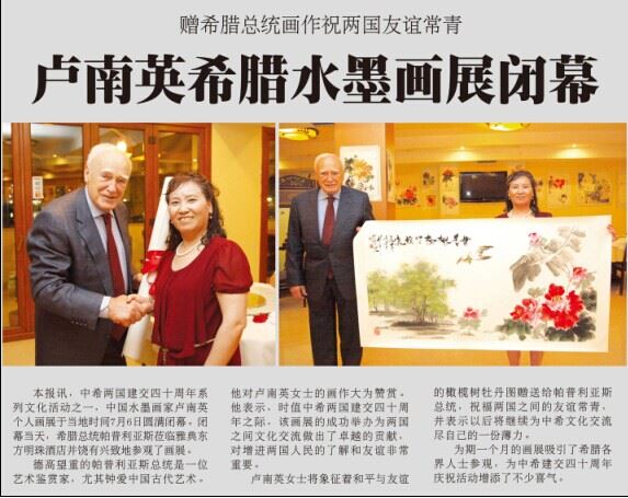 2012年6月至7月, 中国水墨画家卢南英个人画展, 在希腊雅典隆重举办. 作为中希两国建交四十周年系列文化活动之一, 该画展获得了希腊政府及各界人士一致好评(特别是画展闭幕式当天, 德高望重的希腊总统帕普利亚斯亲自莅临, 并给予其超高评价)