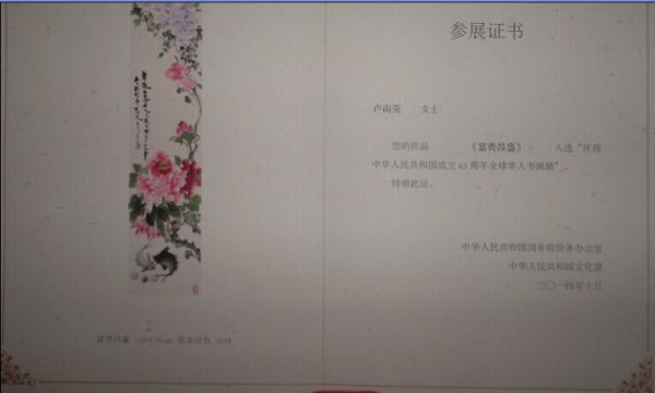 2014年10月1-7号牡丹作品入围中华人民共和国国务院办公室. 中华人民共和国文化部全球华人书画展