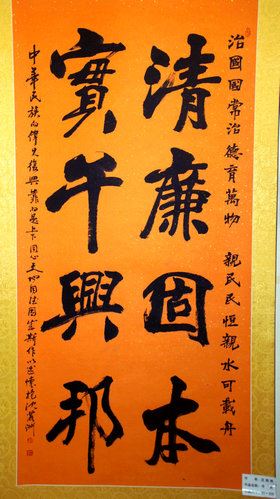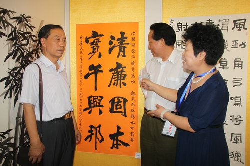 我国著名书画家、中国书法家协会会员、载人航天女子书画第一人沈丽洲女士书写的《清廉固本 实干兴邦》书法作品入选展览。毛主席扮演者特型演员、中国广电协会电视文艺工作文员会理事天蛟应邀到场祝贺。