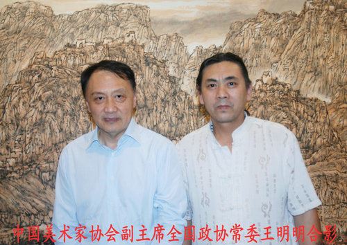 宋付友和中国美术家协会副主席王明明在一起亲切交流 走进河北墨缘堂书画院,宋付友正在作画,给人的印象是一位率真、勤奋、一心扑在艺术创作上的艺术家。仔细观看他画室墙上的花鸟画取材十分广泛,山南海北,一切令人赏心悦目的奇花异鸟在他的手下均可入画。他擅长将花鸟置于宏大的景观中,画面既有山水画般豁达宽博的气势,又具有花鸟画清丽精巧的灵动飘逸。读他的花鸟画,给人最强烈的艺术感受是宏阔空灵、浑然雄健、气韵夺人。