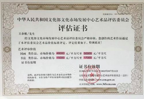 王余根文化部文化市场艺术评估证书