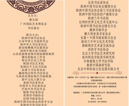 本次大赛,以发扬“一带一路,赞颂和平,合作共赢”的精神,以此为主题,本着“艺无界,通天下”的艺术理念,通过书画艺术来描绘出艺术家对中国社会以及世界和平发展所增添的正能量。由中国墨宝园、书法报社、广州国际艺术博览会主办,欧洲中国书法协会、日本甲骨文书道研究会、新加坡狮城书法篆刻会等30多个单位联合主办。