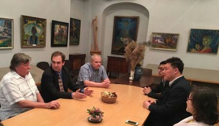 代表团一行与乌克兰国家美术学院副院长奥斯塔普・卡利丘卡等就双方联合开展公益助残项目进行会谈