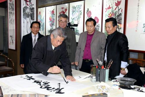 各位领导、嘉宾讲话即将结束时,我国著名书法家王云鹏先生将自己精心创作的一幅毛泽东诗词“沁园春・雪”捐赠给本次活动主办方北京宣和书画艺术研究院。随后,在六届全国人大常委江家福的宣布下拉开了“纪念红军长征胜利80周年书画名家笔会。”