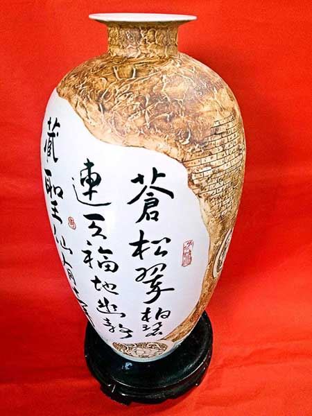 几年前于勇走进了瓷都江西省景德镇、把陶瓷书法作为一个独立的艺术门类加以研究和推广、在打破过去“写字配套”、“文字装饰”形式上作出了很大努力、他把陶瓷传统工艺和书法相溶一体,并得以创新、突出立体感、鲜明的协调性、周密布详细、移瓶换景……