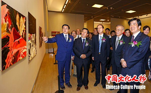 中国美协主席刘大为向中国文联党组成员、副主席、书记处书记左中一,原中国侨联主席、中国侨联顾问林军,中国美协分党组书记、驻会副主席兼秘书长徐里等领导及参观展览的艺术家嘉宾介绍展览作品