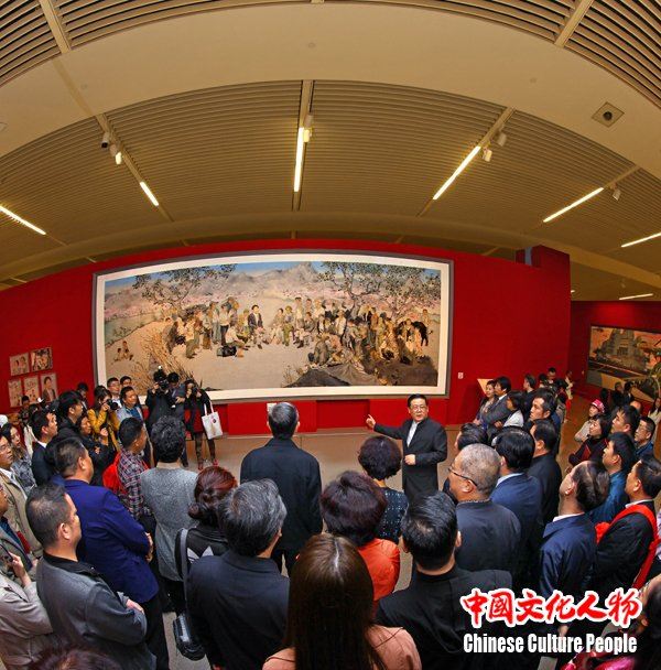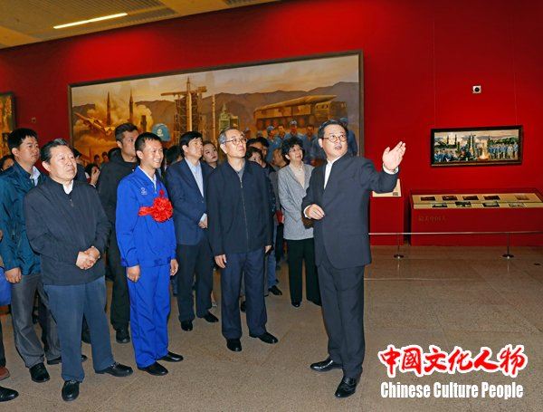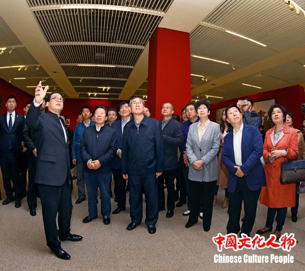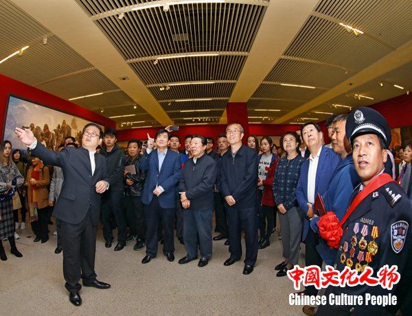 中国美术家协会分党组书记、驻会副主席兼秘书长徐里向十二届全国政协副主席马飚,十一届全国政协副主席、中国文联名誉主席孙家正,中国文联主席铁凝,中国文联党组书记、副主席、书记处书记李屹,中国美术家协会主席刘大为等领导以及艺术家嘉宾和先进人物代表介绍展览作品所刻画的先进人物事迹