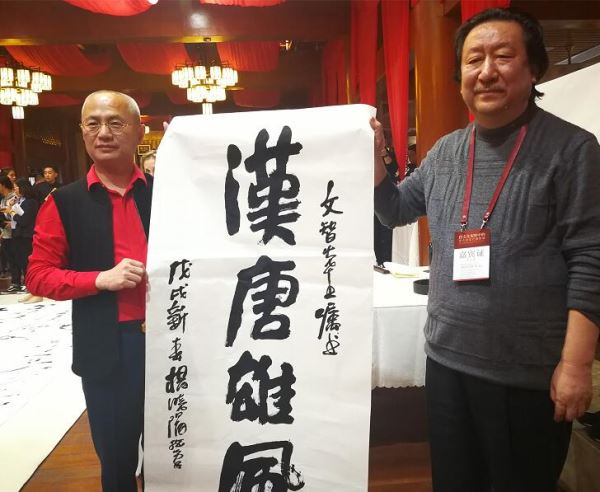 中国国家画院院长、中国美术家协会副主席杨晓阳(右)给叶文智题字,希望艺术凤凰打造“汉唐雄风” (章欣摄影)