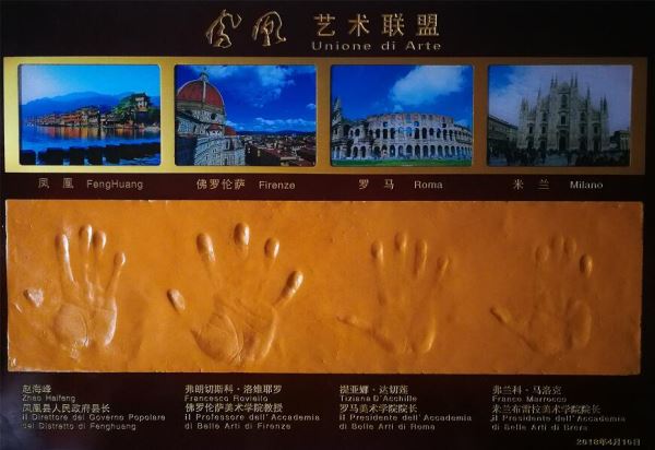4月10日,在凤凰古城举办的“跨文化视野中的意大利当代艺术展”开幕式上,凤凰县县长赵海峰与意大利罗马美术学院院长提亚娜・达切莲、米兰布雷拉美术学院院长弗兰科·马洛克、佛罗伦萨美术学院代表弗朗切斯科・洛维耶罗,共同在“四城艺术结盟”的匾牌上按下手印,开启了凤凰古城结盟意大利佛罗伦萨、罗马、米兰三大艺术重镇美术学院的国际交流合作。