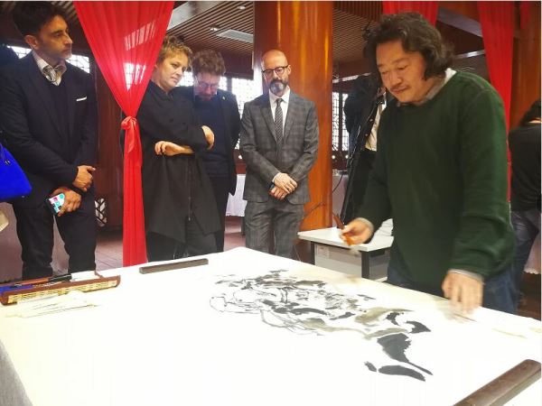 “跨文化视野中的意大利当代艺术展”开幕式后,在凤凰的沱江之滨还上演了一场水墨夜宴,中国国家画院院长、中国美术家协会副主席杨晓阳、中国文联副主席潘鲁生、中国国家画院副院长张晓凌、纪连彬、曾来德等10多位中国艺术名家给意大利艺术家展示了中国水墨艺术。25名意大利艺术家兴致勃勃地观看,并现场学习用水墨进行创作。罗马美术学院院长提亚娜•达切莲表示:“我回到意大利后会继续追寻和介绍东方的水墨文化,让意大利艺术家学习借鉴,从而更好地推广。” (章欣)