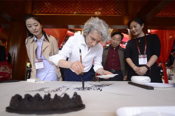 水墨夜宴上,意大利艺术家现场学习中国水墨艺术(杨华峰摄影)