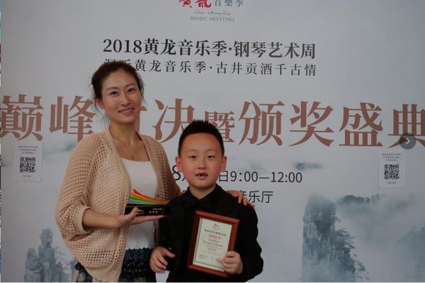 2010年出生的山东潍坊琴童刘项印与母亲在领奖台上 吴勇兵 邓道理摄影