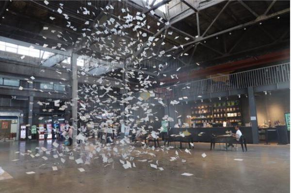 艺术家拉斐尔·海夫提的作品《我们并非前往火星一去不复返的人·平遥I》就是用10吨道路涂料创作的,他将涂料平铺在3000平米的展馆里,置身其中仿佛穿梭在彩虹海洋中非常的绚丽多彩。在谈到作品时,艺术家海夫提介绍说这件作品看起来非常像平面绘画,似乎和雕塑没有多大的关系,但其实这是件雕塑作品,创作的艺术细节非常丰富,有无穷的变化,并且诠释了当下的雕塑概念已经非常宽泛,可以是一个想法,也可以是一束光线和一个装置,艺术家本人也想在中国的古城借此创作来讨论雕塑的边界。此外在平遥古城迎薰门广场大道上,海夫提还创作了一件相同的作品,只是面积会更加巨大。这件作品将会赠予平遥古城永久展示,为充满传统文化符号的古城平遥加注一缕当代艺术色彩。