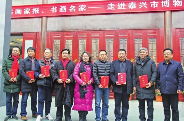 最后,主客双方举行隆重的收藏捐赠仪式。书画家们将他们创作的优秀作品捐赠给泰兴市博物馆,泰兴市文广新局分管负责人向每位书画家颁发收藏证书并表示感谢。