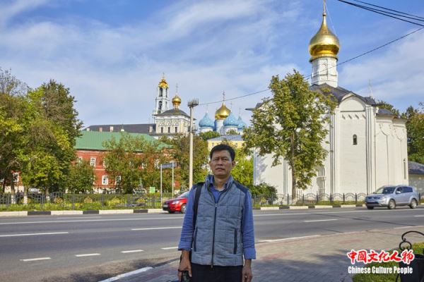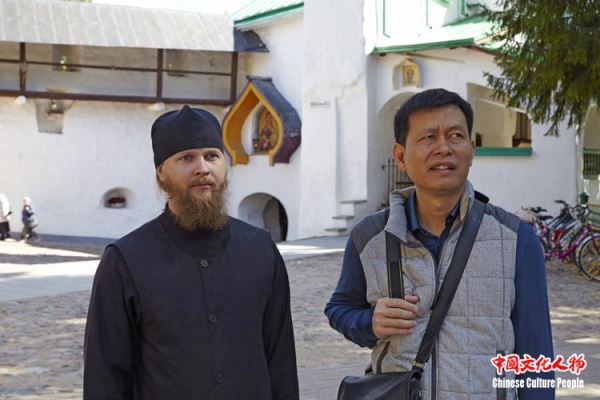 周昌新与普斯科夫洞窑修道院神父在一起交流