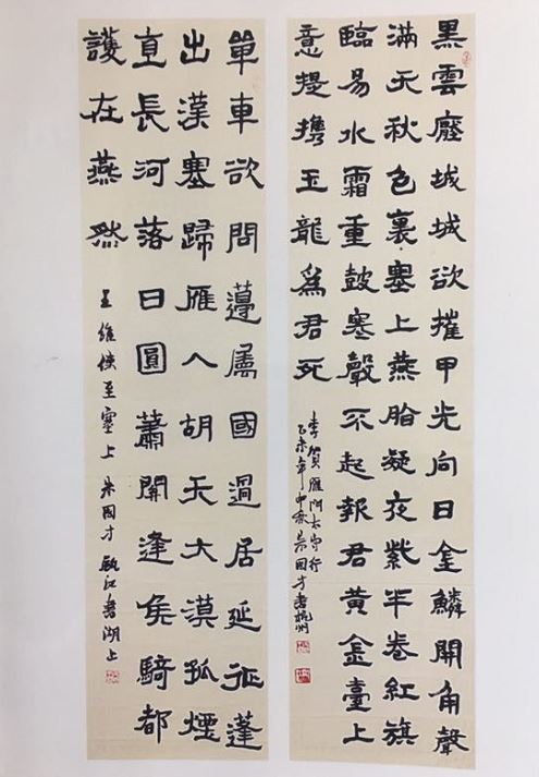 在朱国才书法艺术上,无论是书法名家,还是书法爱好者,大都最喜欢朱国才先生的行草,觉得无论用笔还是结体和章法,都很精妙。他的行草用笔和结体不像有的书家单纯模仿某些法书,由于欠些火候,就往往显得虚浮而不沉着,不是让人感觉有“肉”无“骨”,就是有“骨”无“肉”。从他的行草中,就像名家论曰既能感受到二王的情驰神纵、超逸优游、淋漓挥洒、百态横生,又可领略颜柳的雄强浑厚、刚劲峻拔,以及米芾的不拘常规、因势生形……难怪有论者评曰:“他学古而不落窠臼,创新而不囿时风,仅是从古人运笔、结字和章法中获取基本技巧与规律,为己变革创新之用。”如他的作品《于若瀛诗龙井茶歌》,我未见过他的原作,是书上看到的。通篇125字,字字笔沉墨实,力透纸背,其笔法方圆并施,既有方硬险劲的魏碑意象,又有丰满浑厚之隶意,结体紧凑而活泼,气势开张,奇正相生。另一幅行书巨作《王维诗洛阳女儿行、老将行》长达349字, 比之前一幅,显得法度森严,其笔势稳中求变,既笔笔交待到位,又笔笔处置精微,结体也就愈益潇洒古淡,令人回味无穷。