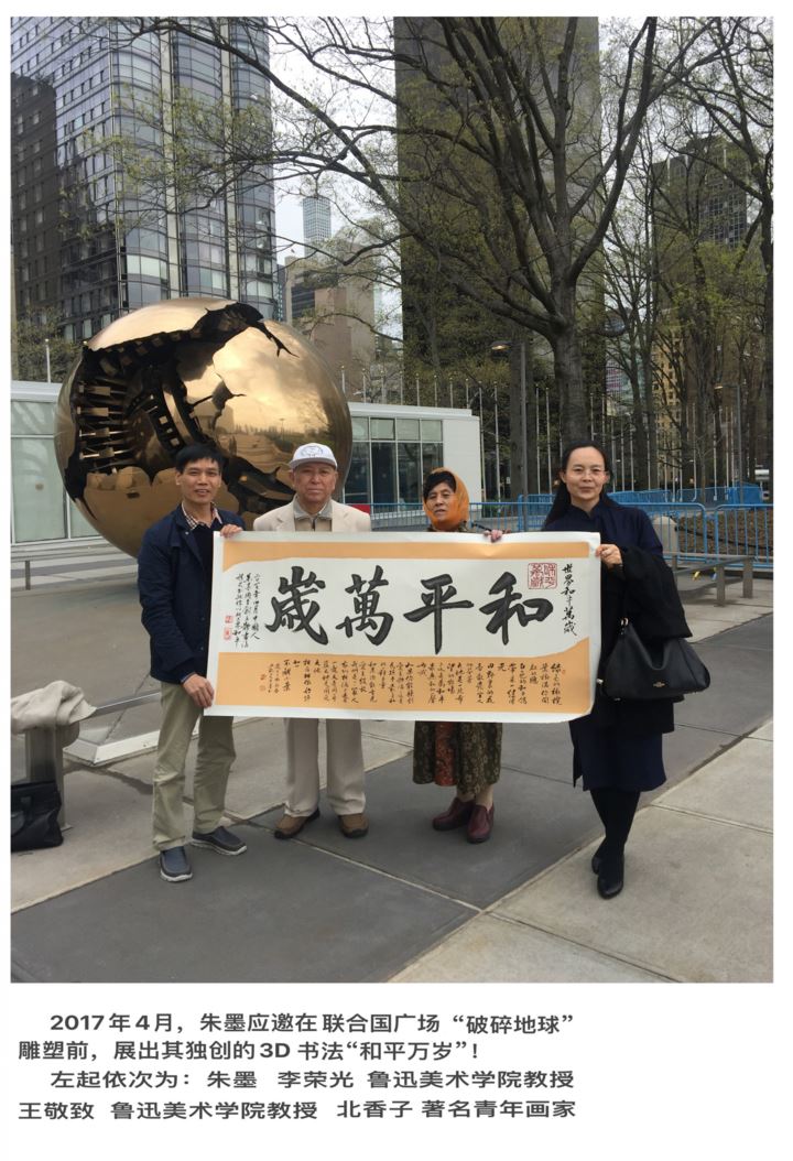 △2017年4月20日,朱墨站在联合国广场“破碎地球”雕塑前有感!