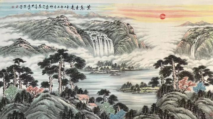 他的巨幅国画作品,如:山水、松树、木棉题材的作品,气势磅礴、浩气凌空。站在他的画作前,你不由得会让胸怀领略到一种宽阔和浩然之气。